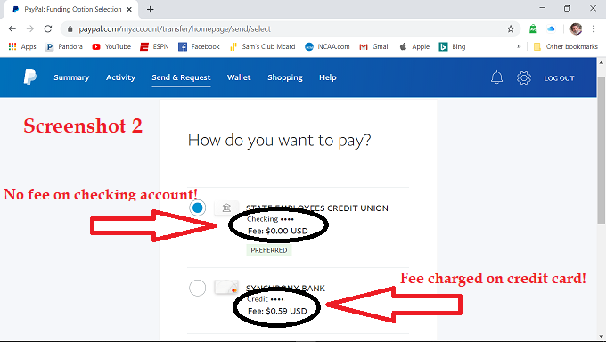 In order to avoid fees being charged to the association, please make sure that you choose the "Sending to a friend" option. See Screenshot 1 below! If you pay from a linked bank account when choosing this option there are no fees charged.